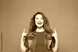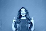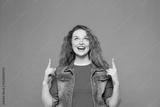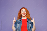 Young surprised ginger woman she wears red t-shirt denim shirt point index finger overhead indicate on area mock up isolated on plain pastel light purple background studio portrait. Lifestyle concept.