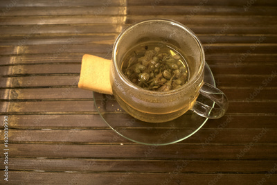 A tisane tea, an infusion of fragrant herbs, fruit, bark, flowers, or spices, steeped or simmered in hot water, usually caffeine-free