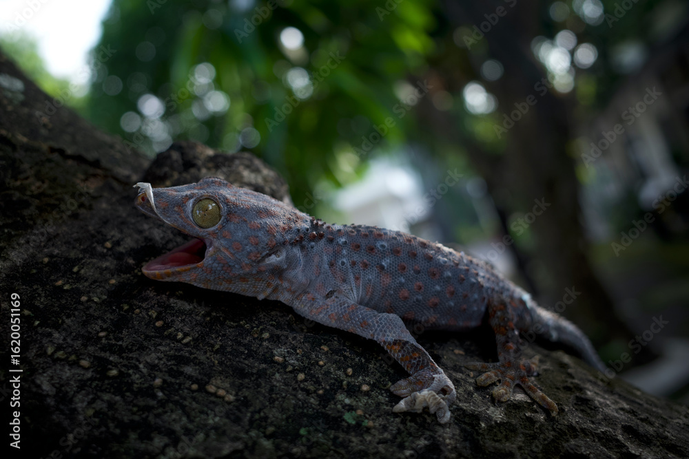 Close up of a Tokay gecko, Gekko gecko shedding skin process on a tree trunk