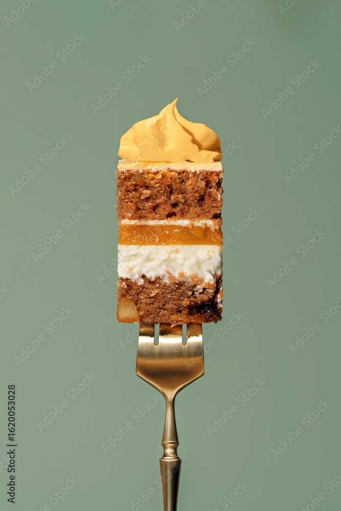 Colorful bento carrot cake slice with orange and mango filling, held by a golden fork, showcasing layers of sponge, cream, and frosting against a soft green background