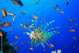 Lionfish surrounded by Lyretail Anthias