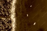 Coastal area with three boats on blue clear water and forest on land - aerial view taken by drone
