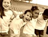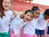 Group portrait of children team havinng exercise athletics class at stadium. Sport, unity, togetherness, teamwork, healthy life concepts