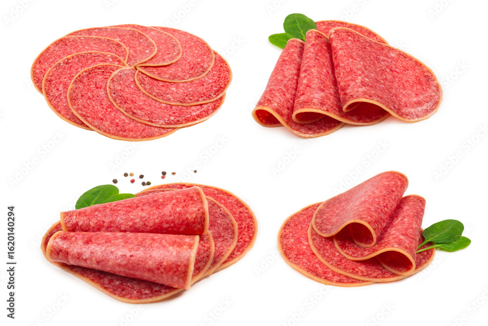 Salami slices isolated on white background.