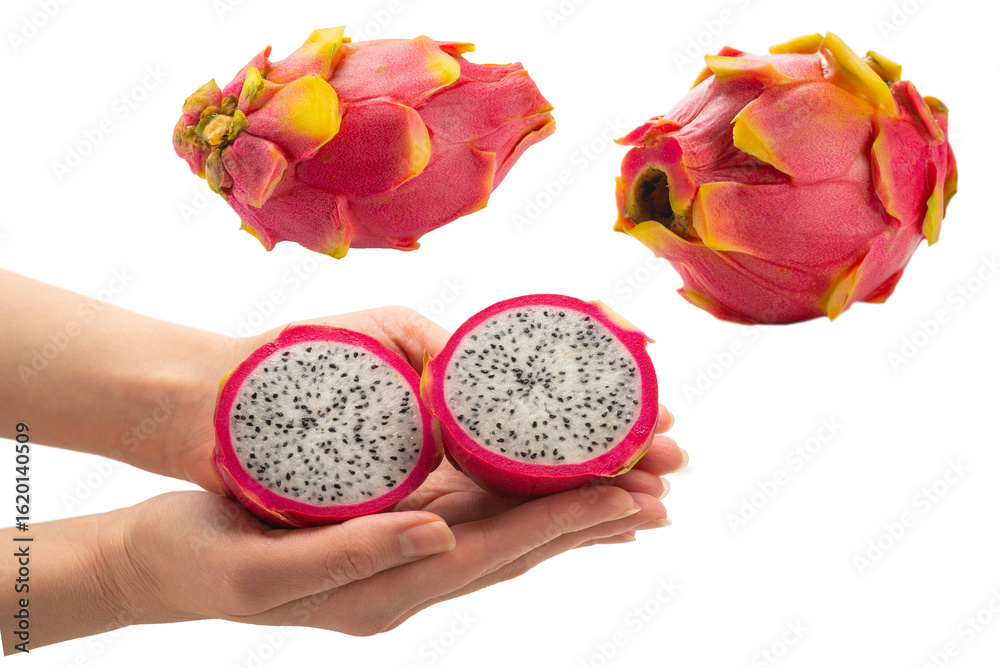 Sweet tasty dragon fruit or pitaya in woman hand isolated.