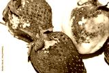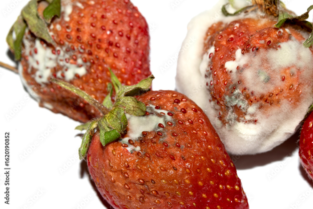 Close up of mouldy fruit strawberry strawberries on white background