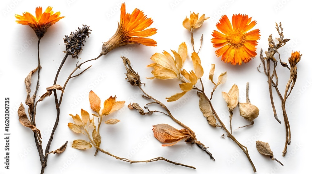 Dried desert flower petals brittle stems arranged on white background suitable for arid region flora illustrations botanical research and nature contrast visuals