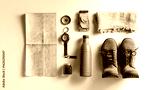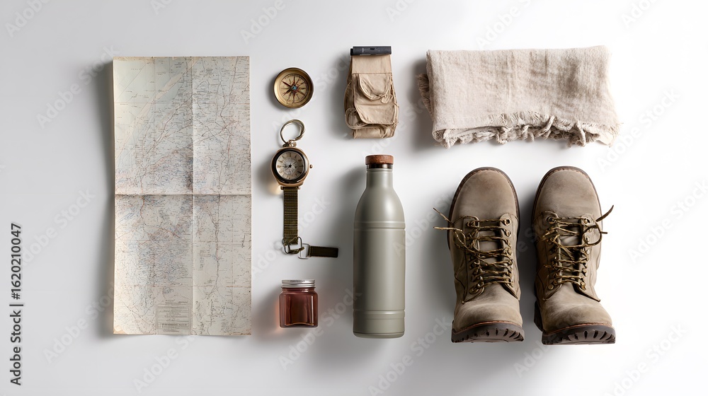 Studio flat lay of desert survival gear including compass map water bottle boots arranged on a white backdrop perfect for adventure blog illustrations travel guides and expedition product visuals