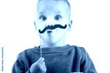 Happy little boy playing with a paper mustache, laughing while doing face, on white background,