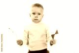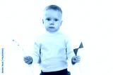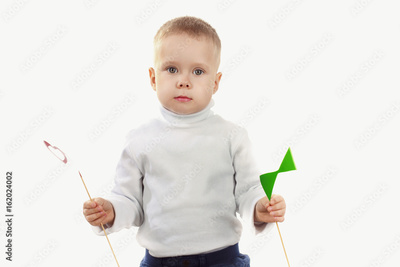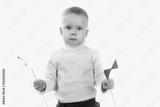 Happy little boy playing while trying on a paper crown, laughing making face on white background