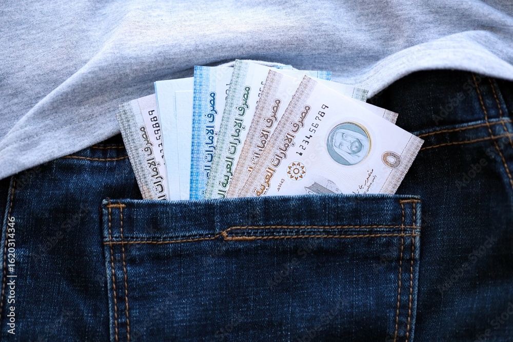United Arab Emirates dirham money bills in denims pocket. The concept of fashion and wealth