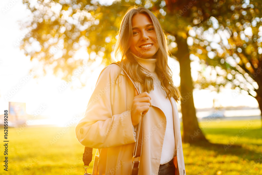 A young woman stands in a sunny park and enjoys a walk. A beautiful woman in stylish clothes relaxes outdoors. Walking, beauty and fashion concept.