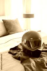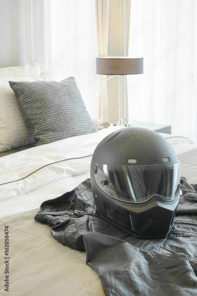 Motorcycle helmet and leather jacket setting on bed in modern bedroom