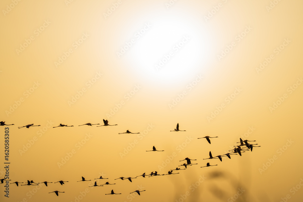 Flock of Flamingos Flying at Sunset in Silhouette
