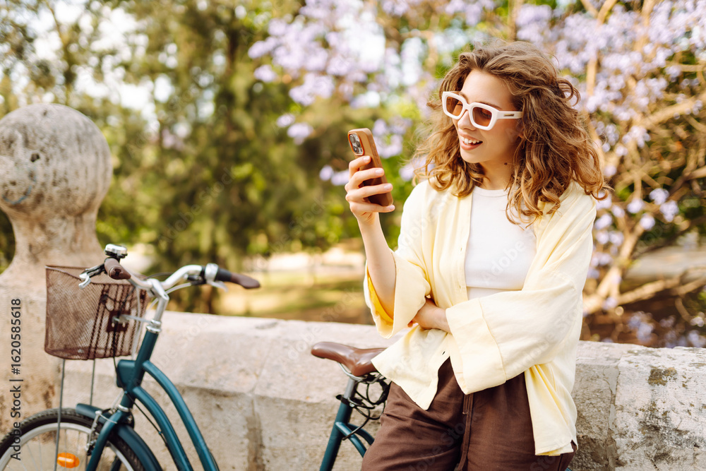 A cheerful tourist with a phone in her hands rides a bicycle on a sunny day in the park. A young woman enjoys a walk at sunset, blogs or texts on her phone. Blogging, tourism concept.