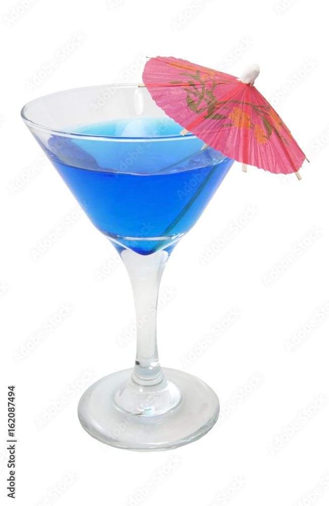 Blue alcoholic drink in martini glass with pink paper umbrella. Isolated.