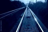 Railway station against beautiful sky at sunset. Industrial landscape with railroad, colorful blue sky with red clouds, sun, trees and green grass. Railway junction. Heavy industry. Evening in autumn