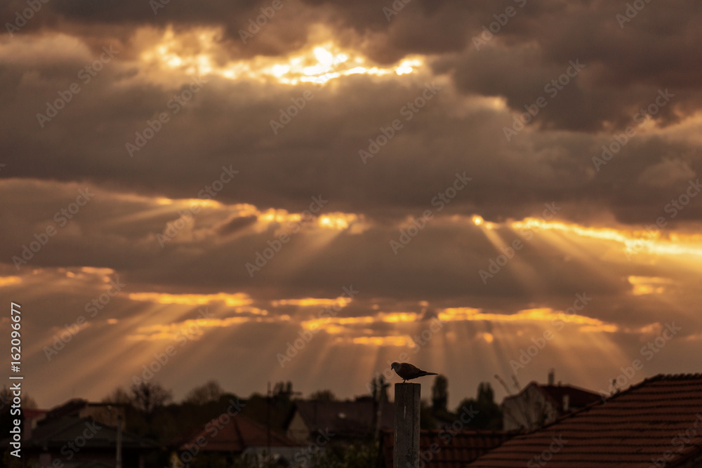 Pigeon staying on a wood with beautiful rays of lights and clouds in background at sunrise.