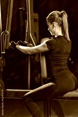 Woman at the sport gym doing arms exercises on a machine. Black and white sport club.