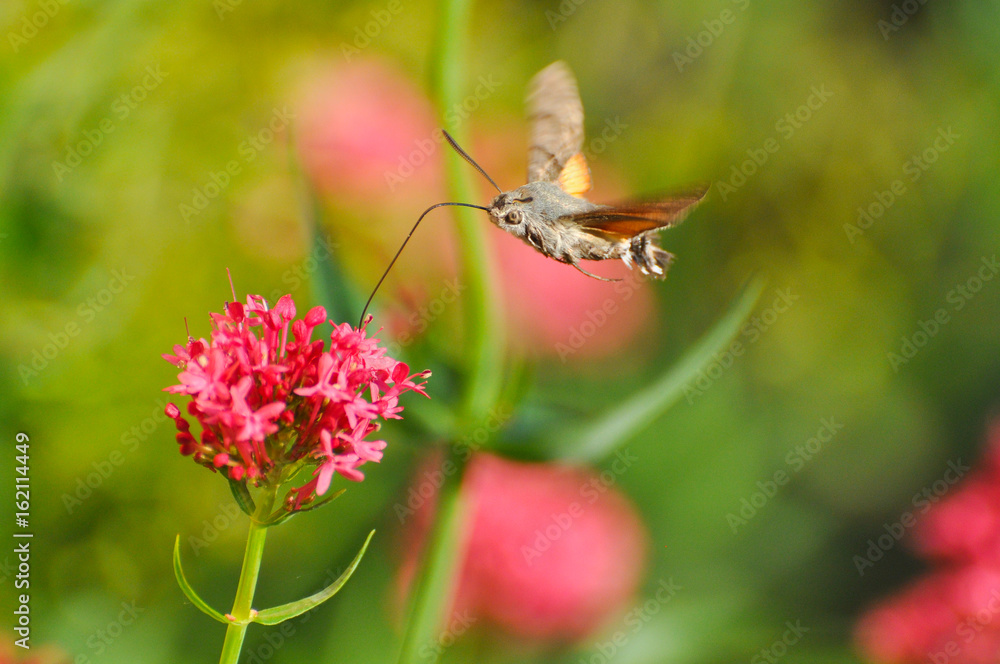 Hummingbird Hawk Moth (Macroglossum stellatarum) sucking nectar from wildflower. Hummingbird hovering over pink flowers
