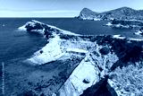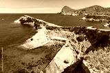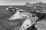 Boat houses at Punta Galera bay surrounded by amazing stone formations, Ibiza island, Spain