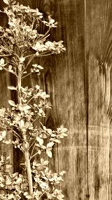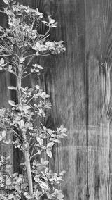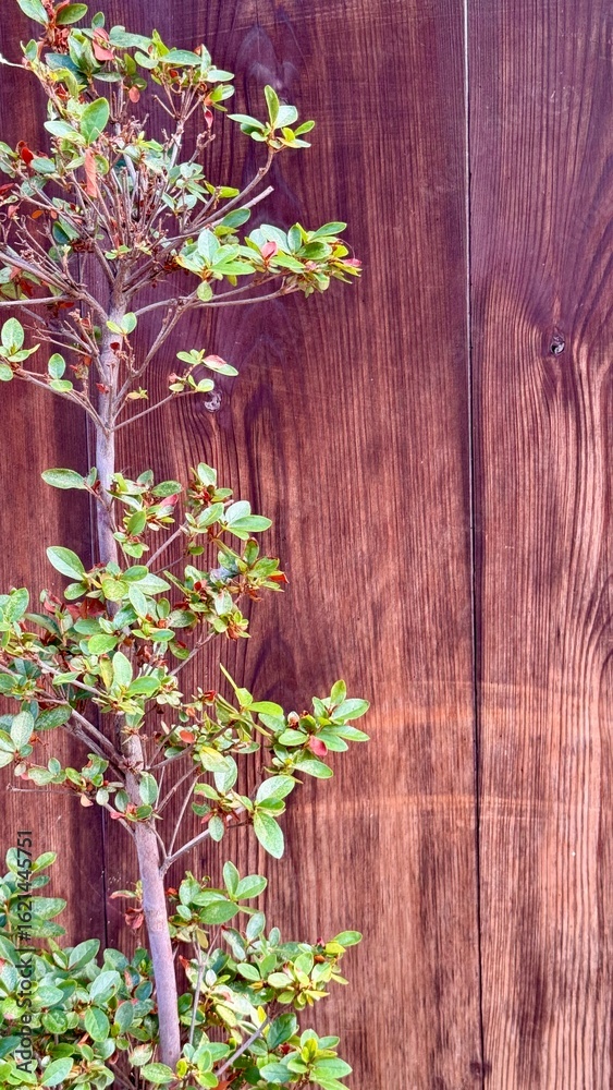 Vertical image of a dark brown wooden background of an old Japanese house framed by branches with green leaves of a bonsai tree outdoor at daytime in Japan with space for text.