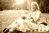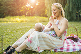 Mother holding baby on lap and clapping hands to make her happy. They are enjoying together beautiful summer day in the nature.