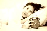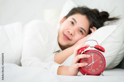 Asian women wake up from sleep. her hands hold at the clock And trying to turn off the alarm clock in the morning on the weekend in Relax and weekend concept.