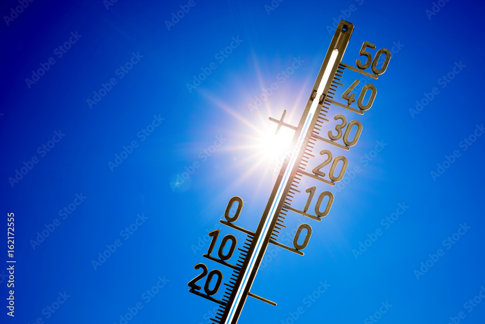 Thermometer mit strahlender Sonne und blauem Himmel im Hintergrund