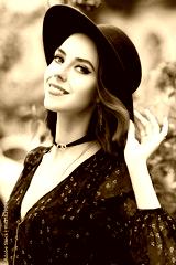 Outdoor close up portrait of young beautiful happy smiling woman looking at camera, posing in street. Model wearing stylish green fedora hat, purple dress, choker necklace. City lifestyle