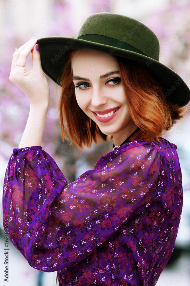 Outdoor close up portrait of young beautiful happy smiling woman looking down, posing in street. Model wearing stylish green fedora hat, purple dress. City lifestyle. Female fashion concept