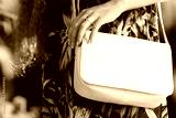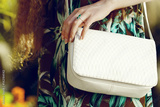 Close up of small white quilted stylish leather bag. Elegant, trendy summer outfit. Fashionable woman posing in street. Model wearing green dress with tropical print. Female fashion concept.