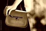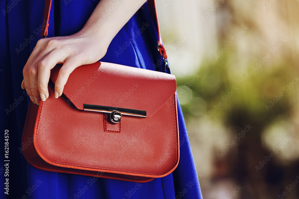 Small red stylish leather bag. Elegant, trendy outfit. Fashionable woman posing in street. Model wearing blue skirt. Female fashion concept. Close up. Copy, empty space for text
