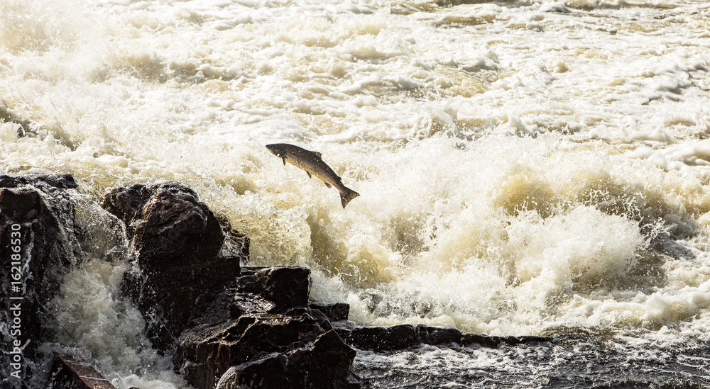 Atlantic Salmon, Salmo salar, leaping in turbulent waterfalls in Kristiansand, Norway