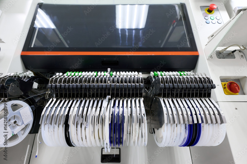 Advanced tape feeders on SMT pick-and-place machine operate efficiently in high-tech assembly line during manufacturing process in electronics factory