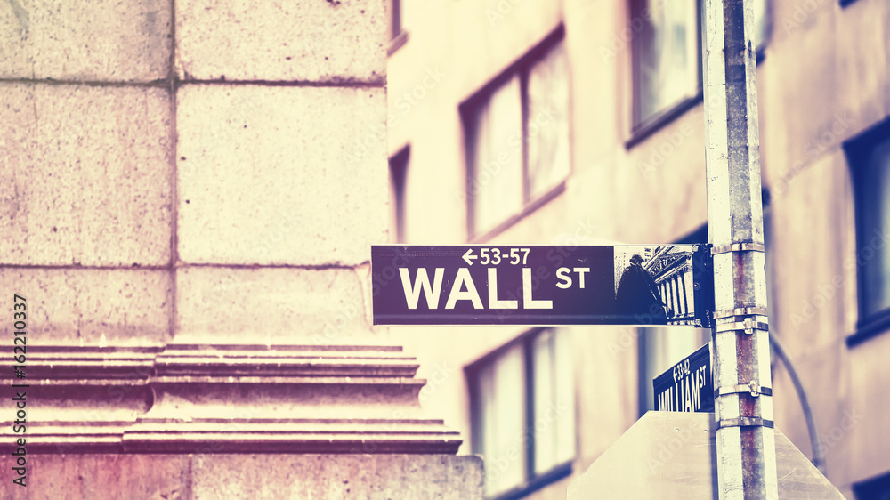 Wall Street sign, shallow depth of field, color toning applied, New York City, USA.