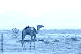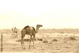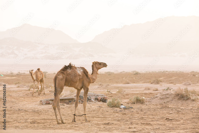 Camels With tied legs standing in Bedouin desert village near Nabq during a safari tour