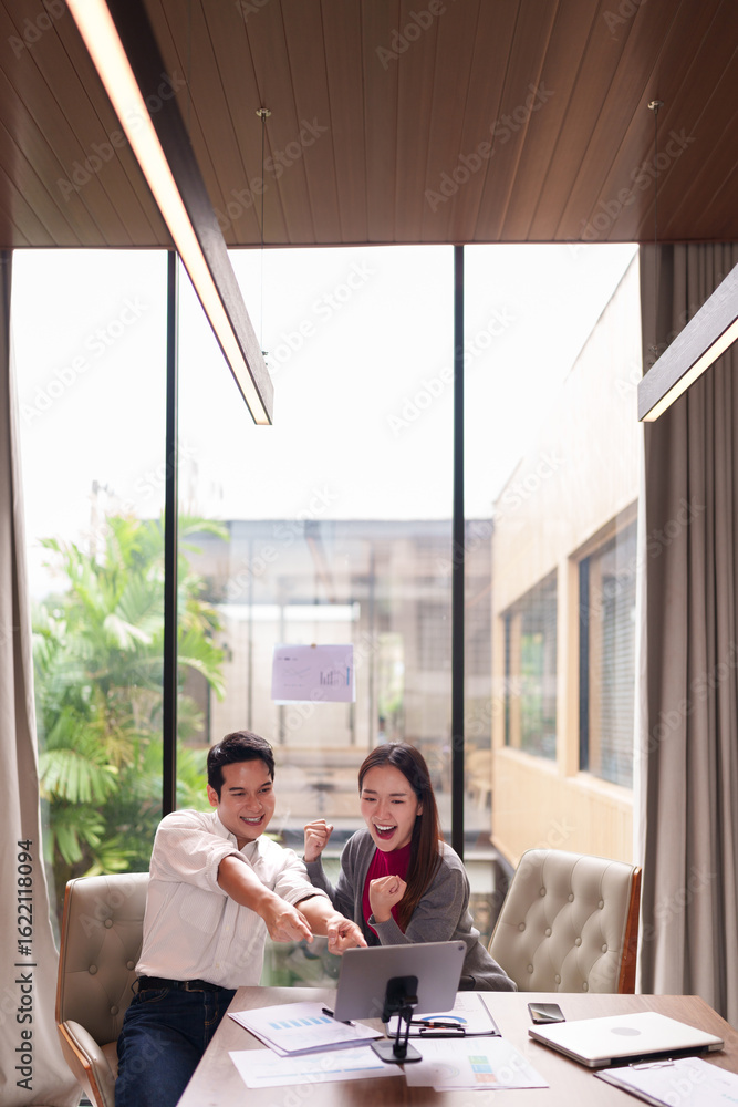 Business professionals celebrating success digital screen modern office teamwork achievement