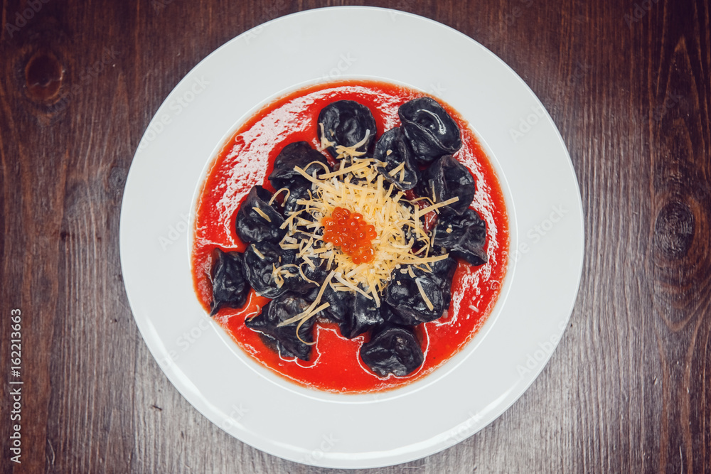 Black ravioli with salmon in tomato sauce decorated with cheese and red caviar.