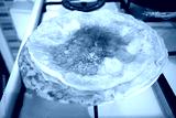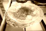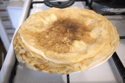 A pancake placed neatly on a white plate, photographed in close-up. The image highlights the smooth surface and gentle fold of the pancake.