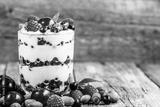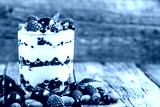 Healthy yogurt with fruits or sundae ice cream in a cup, summer dessert concept
