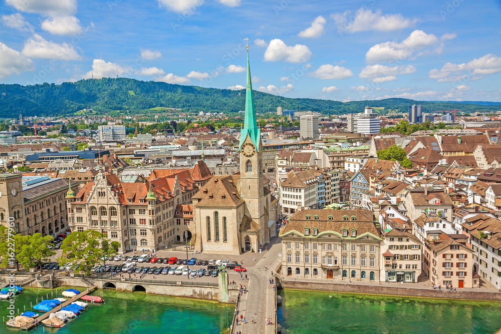 Minster Fraumunster with city center of Zurich, Switzerland - aerial view