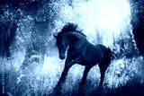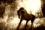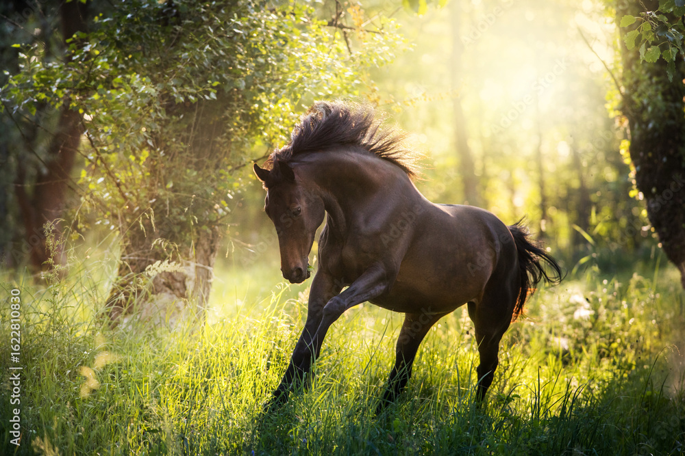 Horse in motion on sunrise forest