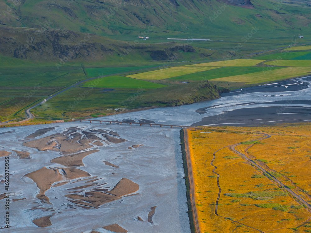 Aerial view of a braided river system with silty channels, a bridge, yellow fields, green farmland, and rugged hills at sunset in Iceland.