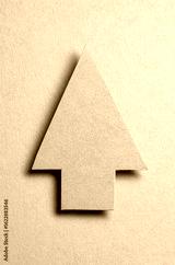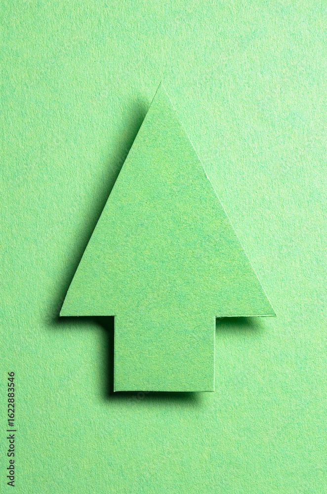 Cut out blank paper cardboard arrow direction sign with copy space for text on green background, flat lay top view pointing symbol backdrop