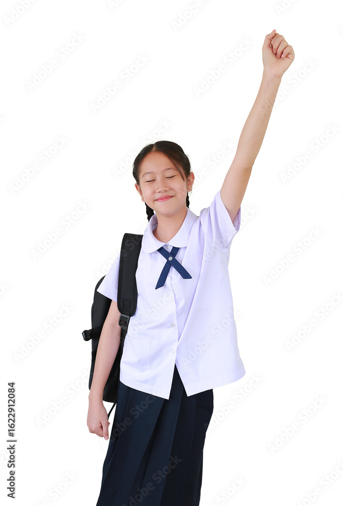 Asian schoolgirl in school uniform carrying backpack bag while raised hand fist for fight sign or winner isolated on white studio background, Closed eyes with smiling.