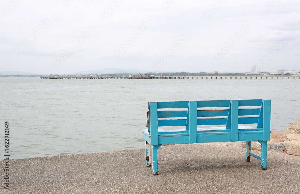 Wooden chair on the shore of sea with cloudy sky at the morning.