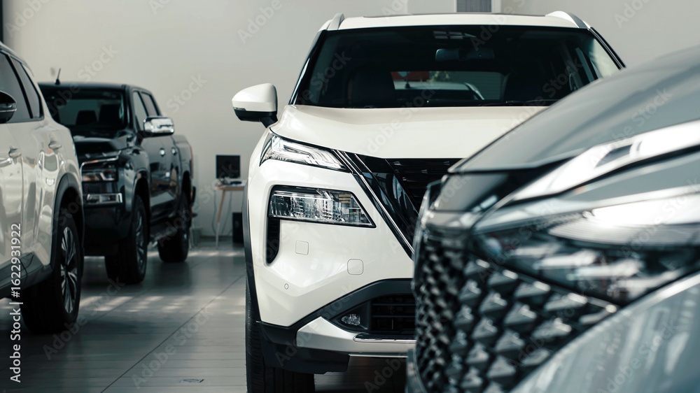 Modern car showroom featuring sleek vehicles in a well-lit space, showcasing automotive design and innovation for potential buyers
