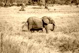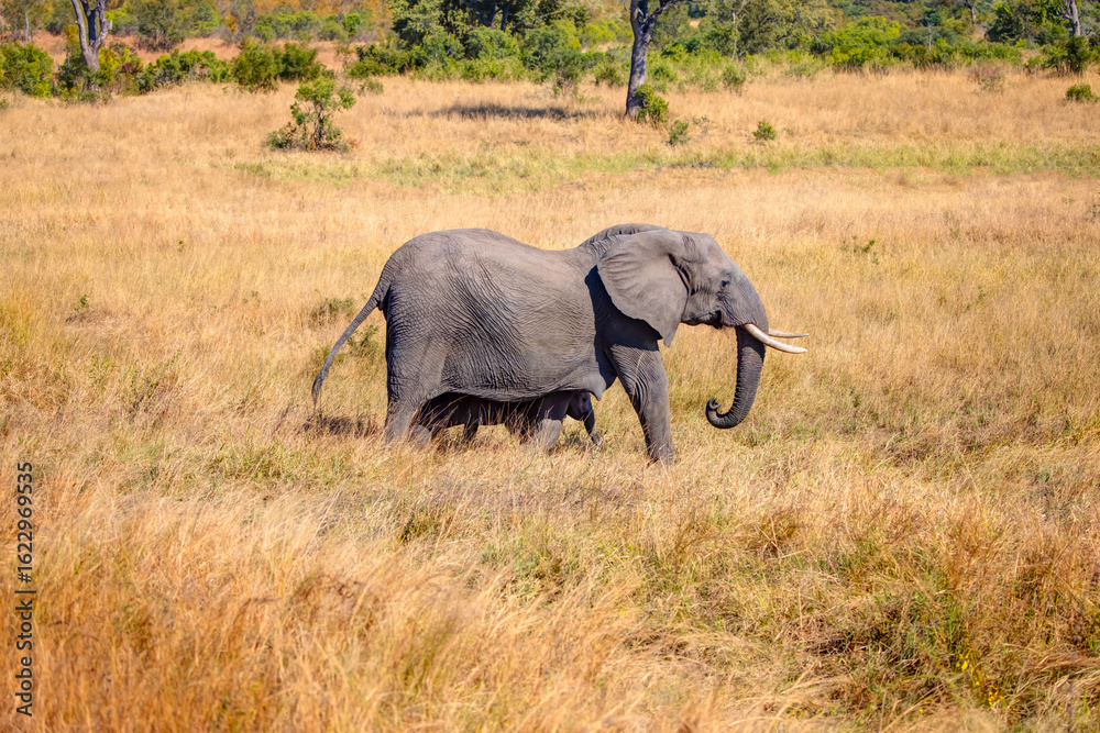 A baby elephant walks through the yellow grass alongside its mother - Kruger National Park - South Africa.