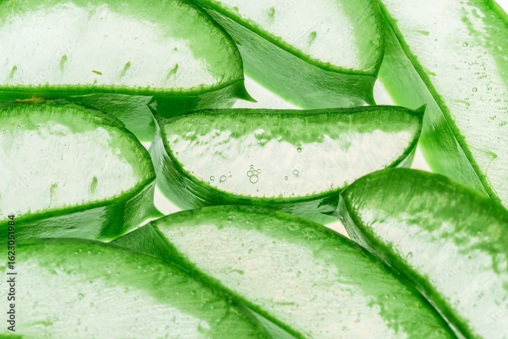 Fresh cuts of aloe vera leaf, macro shot of inner gel.